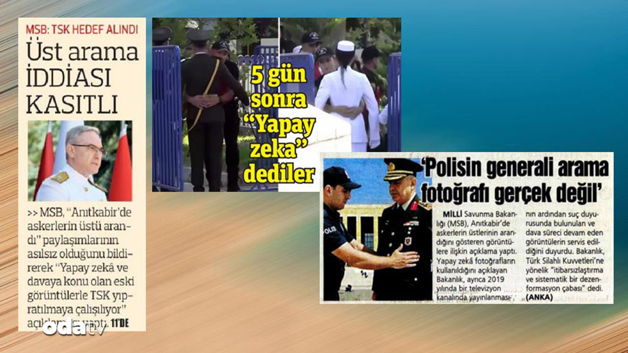 Açıklamada ayrıca “aileleriyle gelen askerlerin Anıtkabir’e alınmadığı” iddiası ile “2019’da bir TV kanalında yayımlanan görüntünün tekrar dolaşıma sokulması” da “dezenformasyon ve itibarsızlaştırma” olarak nitelendiriliyor. Yeniden dolaşıma sokulan görüntü de, Yeni Akit Genel Yayın Müdürü Murat Alan’ın “..generalleriniz var ya, hepsi eşek gibi Erdoğan’ın arkasında saf tutuyor” sözlerinin yer aldığı programın görüntüleri. Gerçekten de altı yıl önceki o görüntü son günlerde yeniymiş gibi sosyal medyada paylaşılıp duruyor.